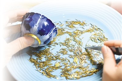 李軍航為殘破瓷器選配鋦釘。 陳其保攝(新華社發)