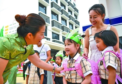 9月3日,在廣西南寧市逸夫小學賢賓校區,老師在校門口迎接新同學。新華社記者 周華攝
