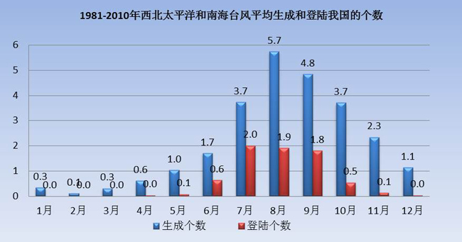圖2 1981-2010年西北太平洋和南海地區(qū)臺(tái)風(fēng)平均生成和登陸我國(guó)的個(gè)數(shù) 李慧 制圖