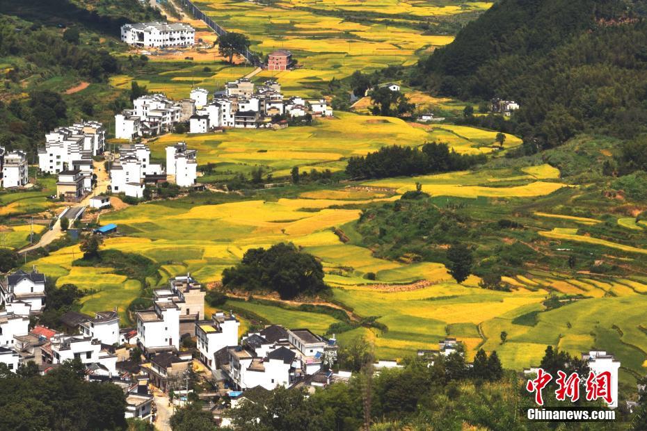 9月13日,在“中國最美鄉村”的江西婺源縣,正值收獲期的金黃水稻與周邊建筑構成了一幅美好的田園豐收圖卷。中新社發 曹加祥 攝