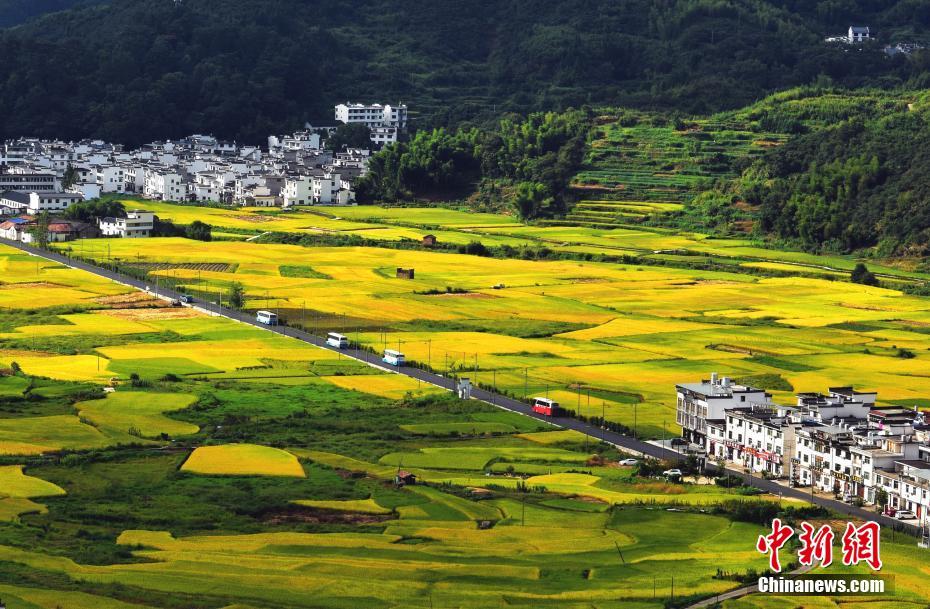 9月13日,在“中國最美鄉村”的江西婺源縣,正值收獲期的金黃水稻與周邊建筑構成了一幅美好的田園豐收圖卷。中新社發 曹加祥 攝