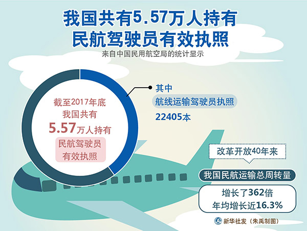 新華社北京9月19日電(樊曦、趙健)來自中國民用航空局的統計顯示,截至2017年底,我國共有5.57萬人持有民航駕駛員有效執照,其中航線運輸駕駛員執照22405本。