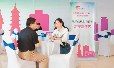 企業(yè)代表在接洽區(qū)進(jìn)行溝通。主辦方為前來參會的企業(yè)專門設(shè)立了一個接洽區(qū),并按行業(yè)和領(lǐng)域進(jìn)行區(qū)分。圖為電子信息和互聯(lián)網(wǎng)接洽區(qū)。企業(yè)代表可以通過服務(wù)臺查詢自己感興趣的企業(yè)聯(lián)系方式。