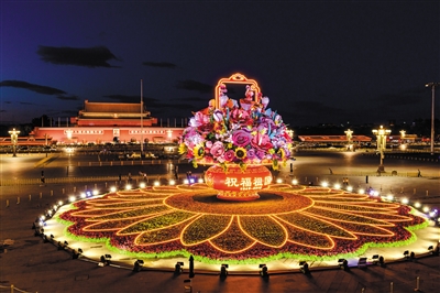 “祝福祖國(guó)”巨型花籃亮相天安門廣場(chǎng)。 受訪者供圖