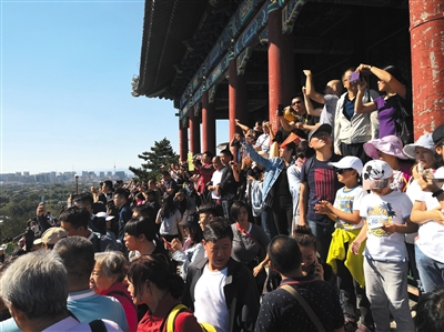10月2日,景山公園內,游客在萬春亭眺望故宮全景。 新京報記者 王飛 攝