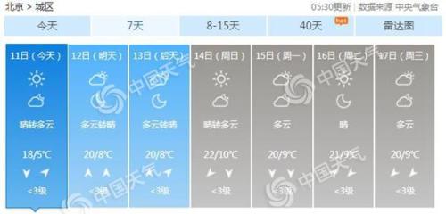 未來(lái)幾天北京仍在回暖當(dāng)中,明后天都是多云轉(zhuǎn)晴的天氣,最高氣溫20℃,最低氣溫8℃。到了周日,最高氣溫將回升至22℃,最低氣溫也回到10℃上下。