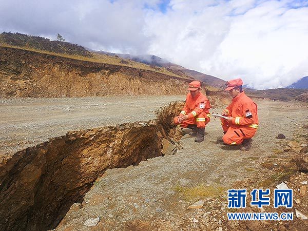 先遣隊員在波公村勘察地質災害情況(10月12日攝)。 新華社發(夏能 攝)