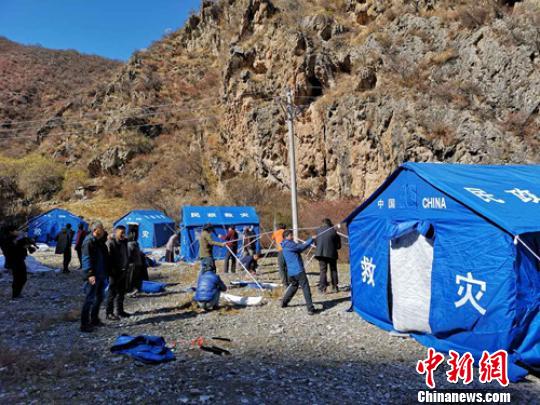 救援人員正在搭建帳篷。 劉忠俊 攝