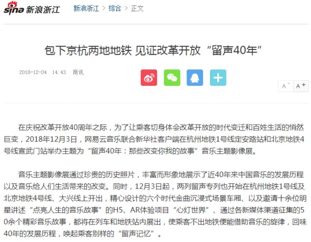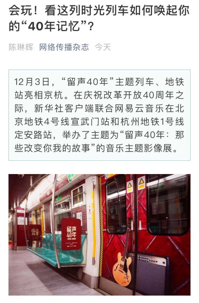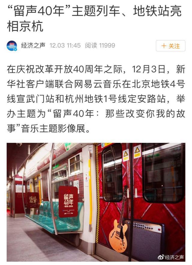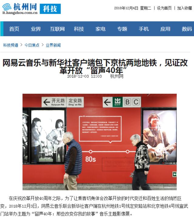 新華社北京12月4日電(記者 牧小湘)為慶祝改革開放40周年,新華社客戶端與網易云音樂、京港地鐵聯合舉辦的“留聲40年:那些改變你我的故事”音樂主題影像展12月3日亮相北京地鐵4號線宣武門站及杭州地鐵1號線定安路站。