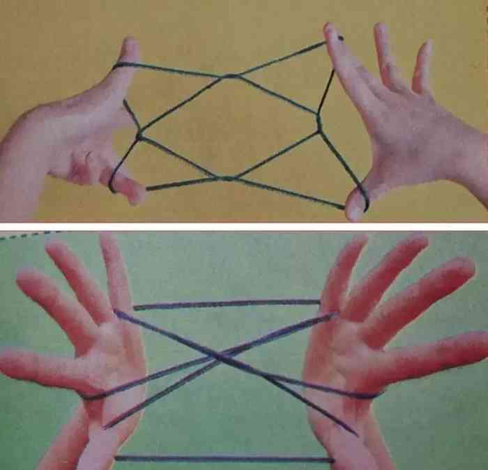 用一根繩子結(jié)成繩套,一人以手指編成一種花樣,另一人用手指接過來,翻成另一種花樣,相互交替編翻,直到一方不能再編翻下去為止。這個(gè)游戲最大的樂趣在于翻出新花樣,展現(xiàn)自己的聰明才智。