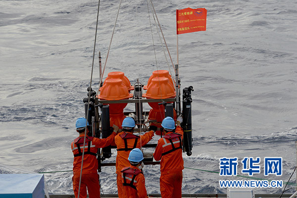 考察隊(duì)員將負(fù)責(zé)采集海水的“彩虹魚”第二代著陸器布放到海里(12月10日攝)。 新華社記者 張建松 攝