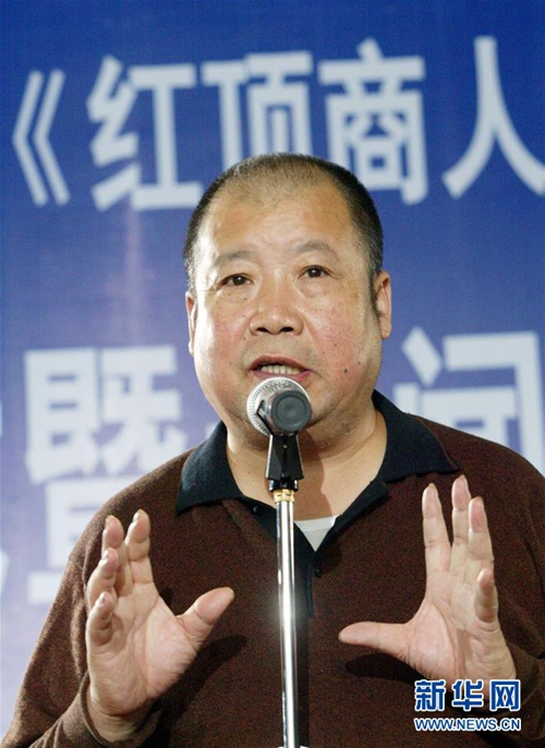 二月河在浙江杭州舉行的電視劇《紅頂商人胡雪巖》開機儀式上講話(2004年10月18日攝)。新華社發