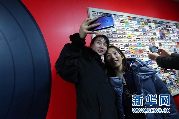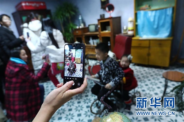參觀者用手機(jī)為兩名小朋友在“時(shí)光博物館”內(nèi)留影。