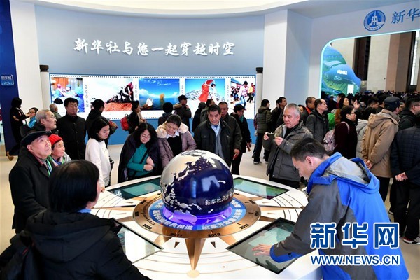 觀眾在新華社展項(xiàng)的“歲月羅盤”互動(dòng)體驗(yàn)項(xiàng)目前參觀。
