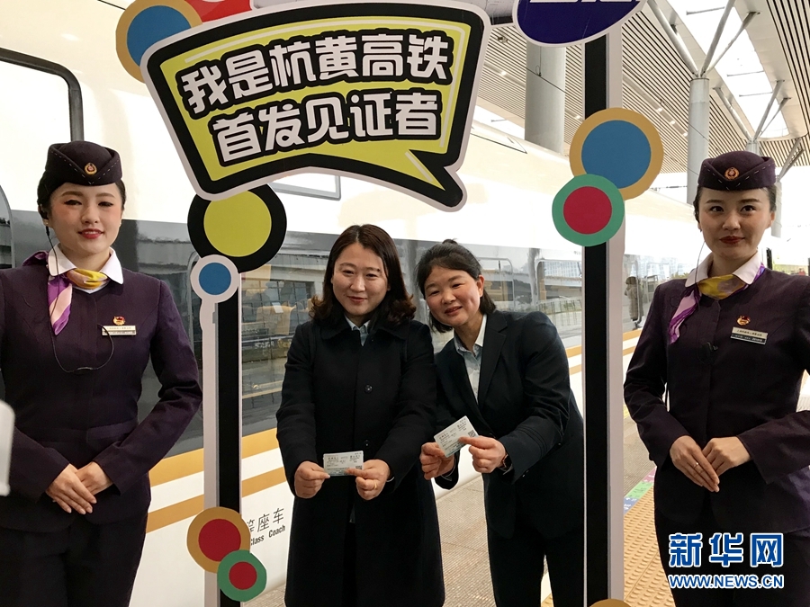 12月25日上午8點34分,從杭州發往黃山的首發車D9551發出,旅客拍照留念。新華網 韓家慧 攝