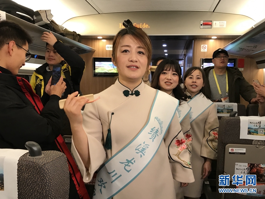 “前世不修,生在徽州;十三四歲,往外一丟。”安徽績溪龍川景區工作人員在車廂內演唱民謠,講述曾經徽州人到余杭經商做學徒走徽杭古道的艱難不易。如今,兩地旅行時間只需一個半小時。新華網 韓家慧 攝