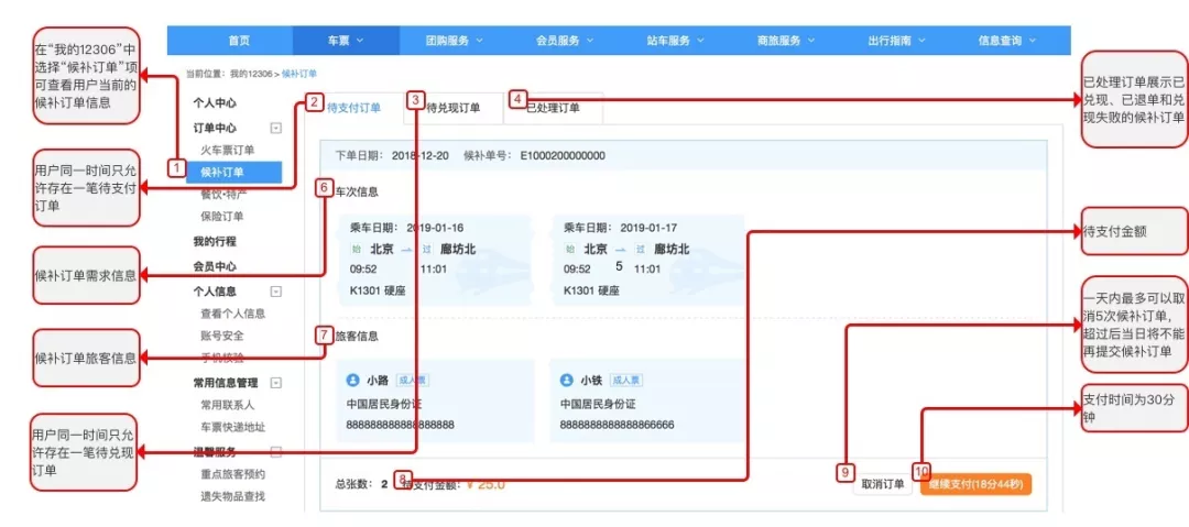 手機(jī)APP示意圖 候補(bǔ)訂單提交成功后需在30分鐘內(nèi)完成支付,完成候補(bǔ)預(yù)付款支付后,候補(bǔ)購(gòu)票訂單立即生效。候補(bǔ)購(gòu)票訂單生效后,相關(guān)候補(bǔ)需求不可修改,如需變更,可終止訂單后重新操作。兌現(xiàn)時(shí),按照候補(bǔ)訂單生效的時(shí)間順序,兌現(xiàn)符合條件的候補(bǔ)需求。預(yù)付款按該單不同組合需求中票款的最高額度計(jì)算(臥鋪按下鋪票價(jià)計(jì)算)。 候補(bǔ)購(gòu)票預(yù)付款支付成功后,系統(tǒng)將持續(xù)嘗試為您兌現(xiàn)候補(bǔ)需求(同一候補(bǔ)需求不進(jìn)行部分兌現(xiàn)),若有匹配需求的車(chē)票,系統(tǒng)將自動(dòng)為您生成已支付訂單,預(yù)付款大于實(shí)際票款的,系統(tǒng)將自動(dòng)退回差額票款;若無(wú)匹配需求的車(chē)票,系統(tǒng)將在截止兌現(xiàn)時(shí)間自動(dòng)終止兌現(xiàn),用戶主動(dòng)終止或系統(tǒng)自動(dòng)終止候補(bǔ)的,系統(tǒng)自動(dòng)全額退還預(yù)付款。 兌現(xiàn)成功或自動(dòng)終止時(shí),將通過(guò)您選擇的通知方式進(jìn)行告知,請(qǐng)注意查收消息并關(guān)注“候補(bǔ)訂單”兌現(xiàn)狀態(tài)。兌現(xiàn)成功車(chē)票視為已購(gòu)車(chē)票,退改簽按既有規(guī)則辦理。 劃重點(diǎn) 候補(bǔ)訂單提交成功后 需要在30分鐘內(nèi)完成支付 預(yù)付款按組合需求中票款最高額度計(jì)算 系統(tǒng)自動(dòng)退回差額票款 登錄12306.cn網(wǎng)站,在個(gè)人中心導(dǎo)航欄上點(diǎn)擊“候補(bǔ)訂單”可進(jìn)入訂單查看頁(yè),候補(bǔ)訂單分為“待支付訂單”、“待兌現(xiàn)訂單”和“已處理訂單”三個(gè)選項(xiàng),其中“已處理訂單”包含已兌現(xiàn)、已退單和兌現(xiàn)失敗三種狀態(tài)訂單,已兌現(xiàn)表示候補(bǔ)需求兌現(xiàn)成功;已退單表示用戶主動(dòng)退單;兌現(xiàn)失敗表示候補(bǔ)需求兌現(xiàn)失敗,可能為車(chē)票數(shù)量不足、與實(shí)名制規(guī)定沖突等原因。