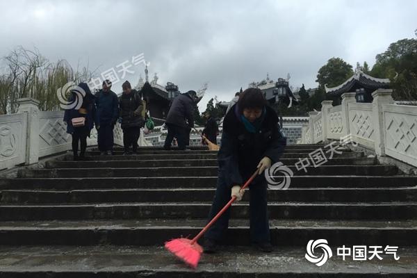 昨天上午,貴陽(yáng)甲秀樓景區(qū)工作人員正在清掃浮玉橋上的結(jié)冰。(楊春竹 攝)