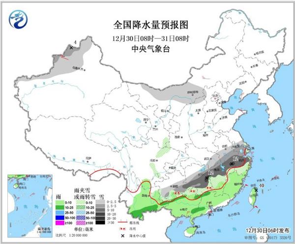 中央氣象臺(tái)預(yù)計(jì),今天內(nèi)蒙古西部、新疆北部、江淮中南部、江漢東部、江南中北部、西南地區(qū)東南部等地部分地區(qū)有小到中雪或雨夾雪,其中,貴州東南部、湖南中部、江西北部、安徽南部、浙江中北部等地有大雪,湖南東部、江西西部和東北部、安徽南部、浙江西部等地局地有暴雪(10~12毫米)。江南南部、西南地區(qū)南部、華南大部和臺(tái)灣島大部等地部分地區(qū)有小到中雨,其中,臺(tái)灣島東北部局地有大雨(25~40毫米)。