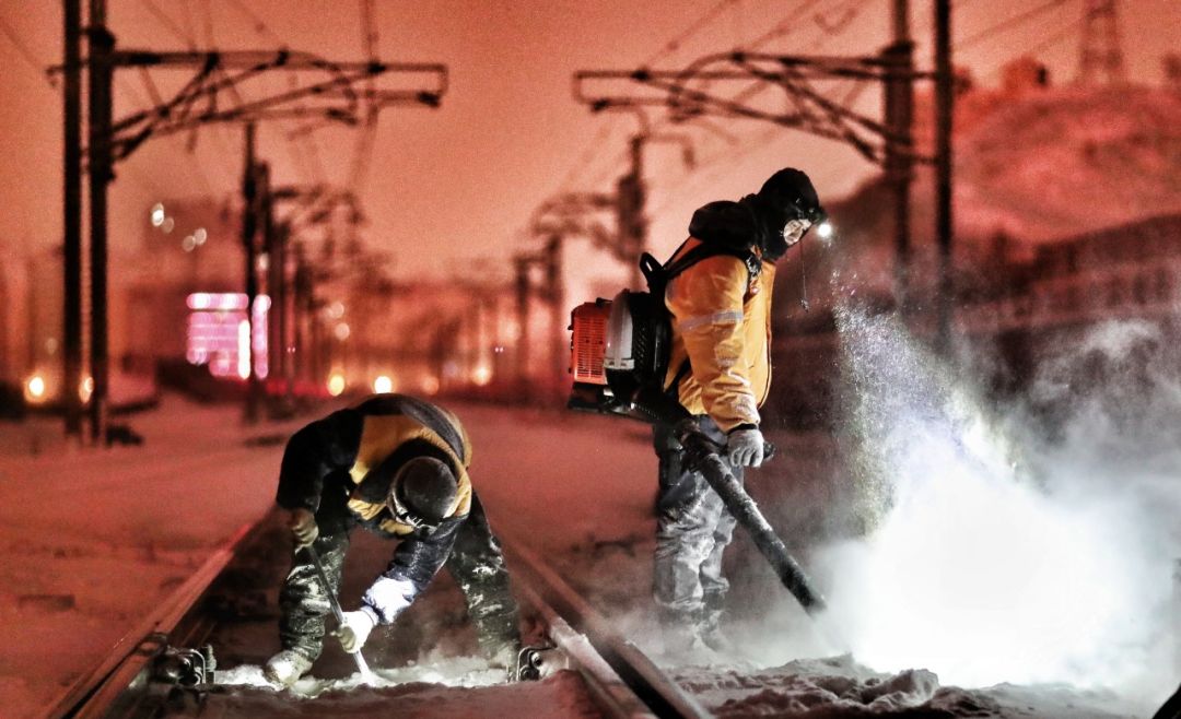 2018-12-05,新疆烏魯木齊站。大雪后,高鐵工務(wù)人對高鐵線路的道岔進(jìn)行除冰清雪作業(yè),保障高鐵安全運(yùn)行。作者:擺風(fēng)亮