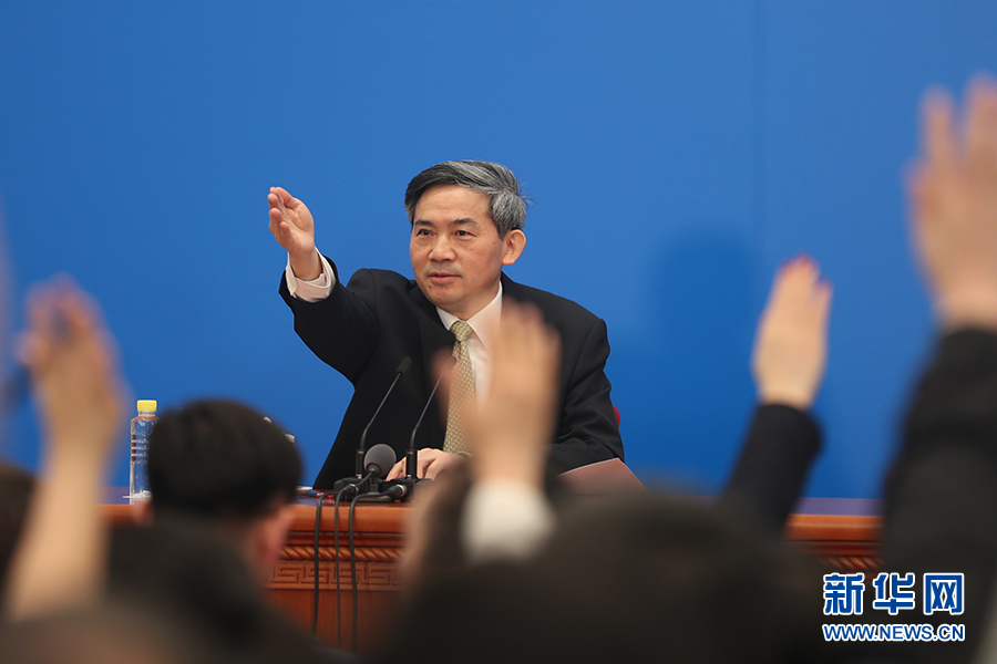 3月4日,十三屆全國人大一次會(huì)議在人民大會(huì)堂新聞發(fā)布廳舉行新聞發(fā)布會(huì),由大會(huì)發(fā)言人張業(yè)遂就大會(huì)議程和人大工作相關(guān)的問題回答中外記者的提問。圖為新聞發(fā)布會(huì)主持人何紹仁。新華網(wǎng)/中國政府網(wǎng) 陳杰 攝