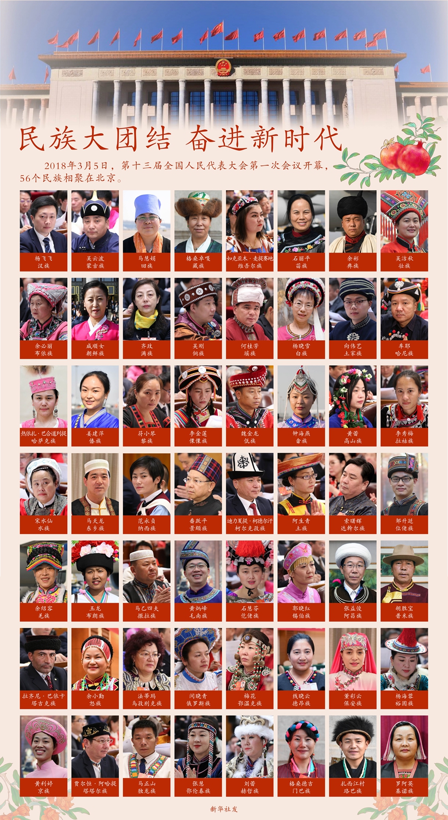 2018年3月5日,第十三屆全國人民代表大會第一次會議開幕,56個民族相聚在北京。