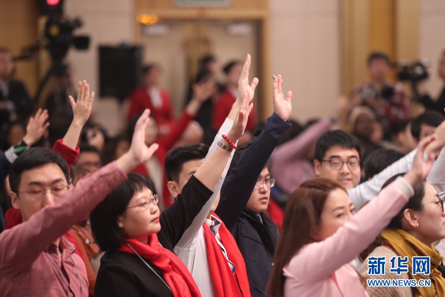 十三屆全國人大一次會議新聞中心于3月7日在梅地亞中心多功能廳舉行記者會,邀請農業部部長韓長賦,農業部新聞發言人、辦公廳主任潘顯政就“實施鄉村振興戰略 推動農業轉型升級”的相關問題回答中外記者的提問。圖為現場記者舉手提問。新華網/中國政府網 陳杰 攝