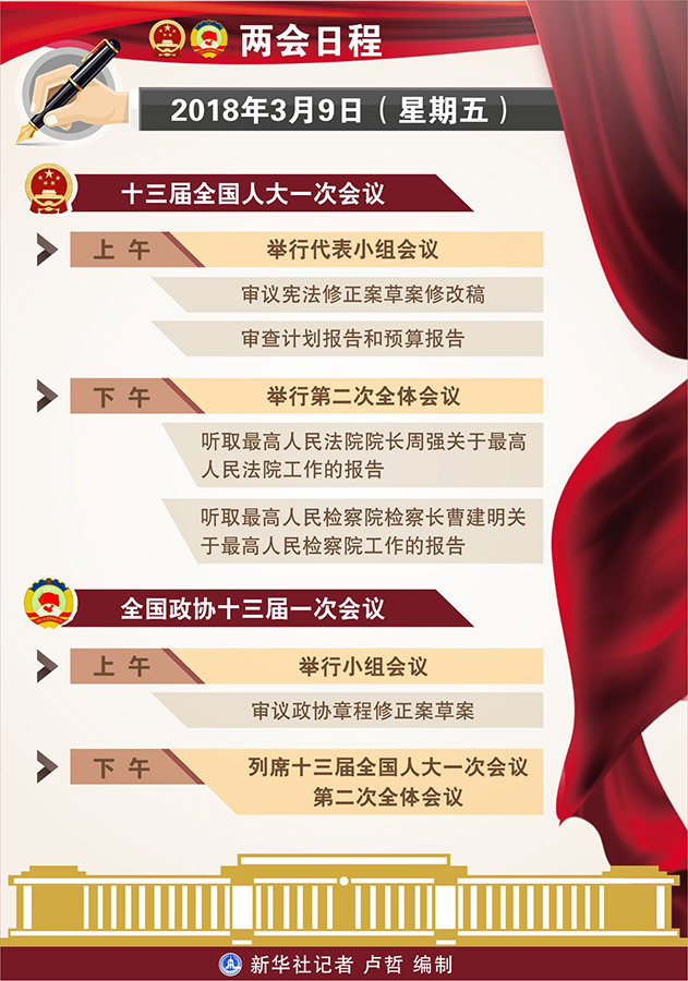 新華社北京3月8日電? 十三屆全國人大一次會議9日上午舉行代表小組會議,審議憲法修正案草案修改稿,審查計劃報告和預算報告。下午3時在人民大會堂舉行第二次全體會議,聽取最高人民法院院長周強關于最高人民法院工作的報告,聽取最高人民檢察院檢察長曹建明關于最高人民檢察院工作的報告。