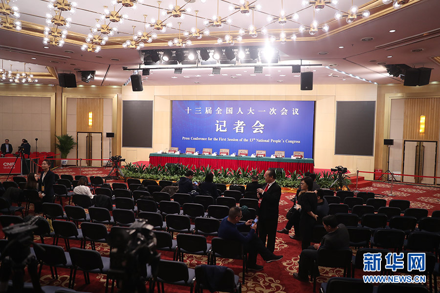 3月12日,十三屆全國人大一次會議新聞中心在梅地亞中心多功能廳舉行記者會,邀請十二屆全國人大內司委副主任委員王勝明、財經委副主任委員烏日圖、教科文衛委副主任委員吳恒、環資委委員呂彩霞,全國人大常委會法工委副主任王超英、副主任許安標就“人大立法工作”相關問題回答中外記者提問。圖為記者會開始前。新華網/中國政府網 翟子赫 攝