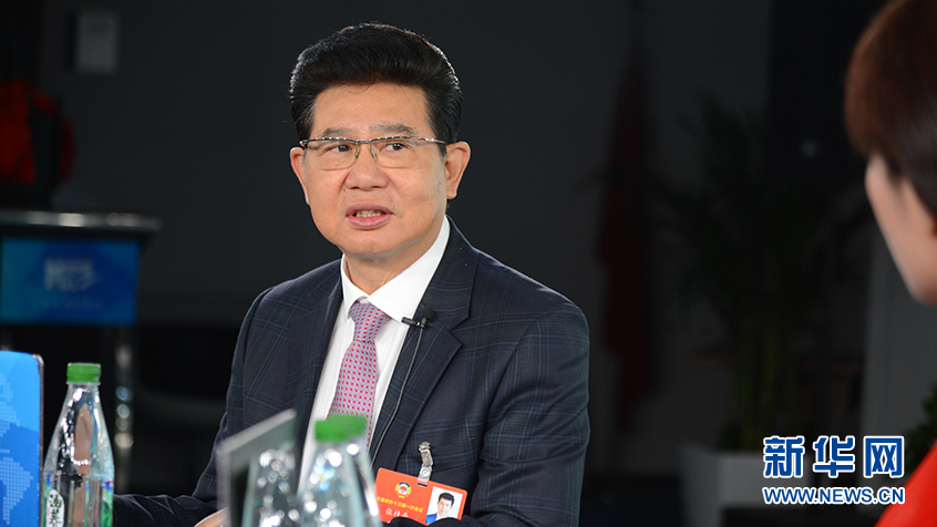 3月14日,全國政協委員、蘇寧環球董事長張桂平(左)做客新華網2018全國兩會特別訪談。新華網 楊濛攝
