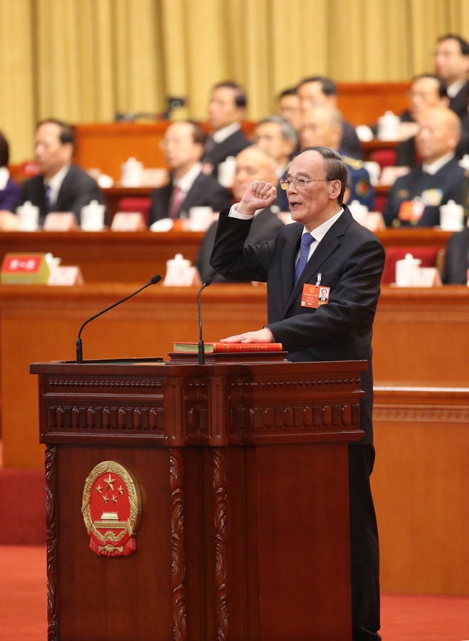 3月17日,十三屆全國人大一次會議在北京人民大會堂舉行第五次全體會議。王岐山當選為中華人民共和國副主席。這是王岐山進行憲法宣誓。