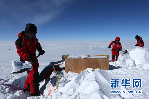 1月5日,科考隊(duì)員在清理昆侖站冰芯房外圍積雪。新華社記者 劉詩(shī)平 攝