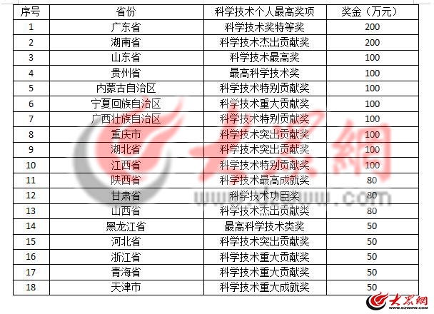 海報新聞記者梳理發現,各地科學技術獎個人最高獎評選時間多為一年一次,也有個別地方如山西等為兩年一次,每次評選人數多為1-3人不等。而獎勵金額也各有不同,但是大部分均在50萬到100萬之間,如山東省、湖北省、江西省等。但是也有個別省份,如廣東省和湖南省高達200萬。