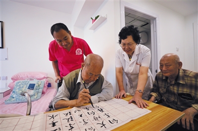 去年9月12日,安貞街道安華怡園養(yǎng)老照料中心開(kāi)門迎客,入住老人在房間里練習(xí)書法。資料圖片/記者 王飛 攝