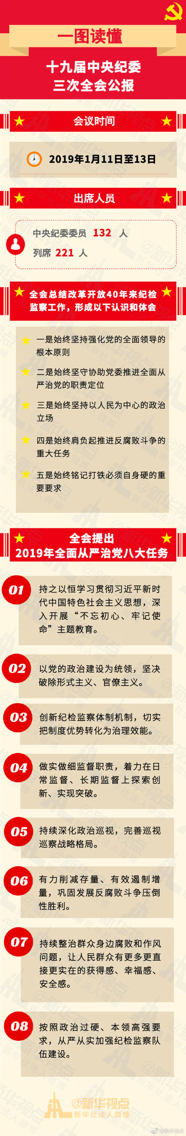 【一圖讀懂十九屆中央紀(jì)委三次全會公報】為期3天的十九屆中央紀(jì)委三次全會13日在北京閉幕。新華社受權(quán)發(fā)布了全會公報。此次中央紀(jì)委全會取得了哪些重要成果?對2019年全面從嚴(yán)治黨、黨風(fēng)廉政建設(shè)和反腐敗斗爭又有哪些新的部署?詳情戳圖