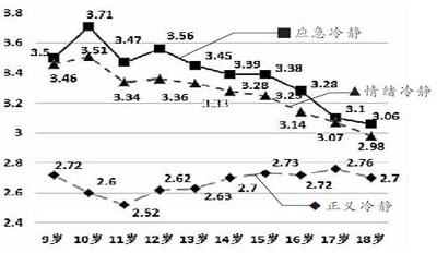 調(diào)查側(cè)重考察了兒童在應(yīng)急情境、情緒激動(dòng)和正義需要援手情境中的冷靜品質(zhì),發(fā)現(xiàn)兒童冷靜品質(zhì)在遭遇不同情境中情緒調(diào)控性表現(xiàn)出不同的發(fā)展趨勢(shì)。在一般應(yīng)急情境和情緒激動(dòng)中的兒童冷靜品質(zhì)分值有隨年齡增長(zhǎng)而下降的趨勢(shì),意味著兒童在應(yīng)急與情緒激動(dòng)情境下隨著年齡增長(zhǎng)而更容易沖動(dòng),不能控制自己;而在遇到有需要援手等正義需求情境時(shí),兒童冷靜品質(zhì)的得分有隨年齡增長(zhǎng)而升高的趨勢(shì),意味著這種情況下,年齡越大的兒童越能控制自己的行為。