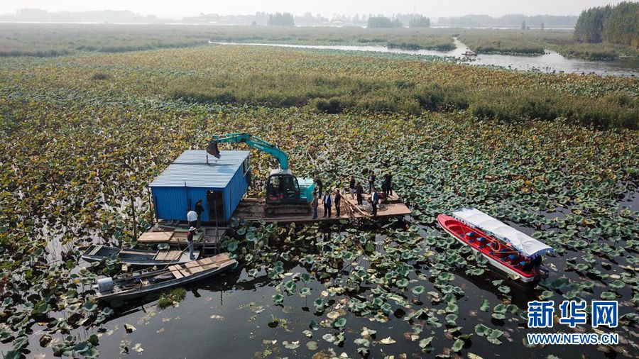 安新縣水產養殖戶在白洋淀清除漁場設施(2018年10月5日攝)。新華網發(張斌 攝)