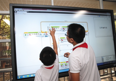 北京十八中學教育集團課程展示活動中的樂高機器人課上,學生正在為機器人編程。資料圖片/記者 王遠征 攝