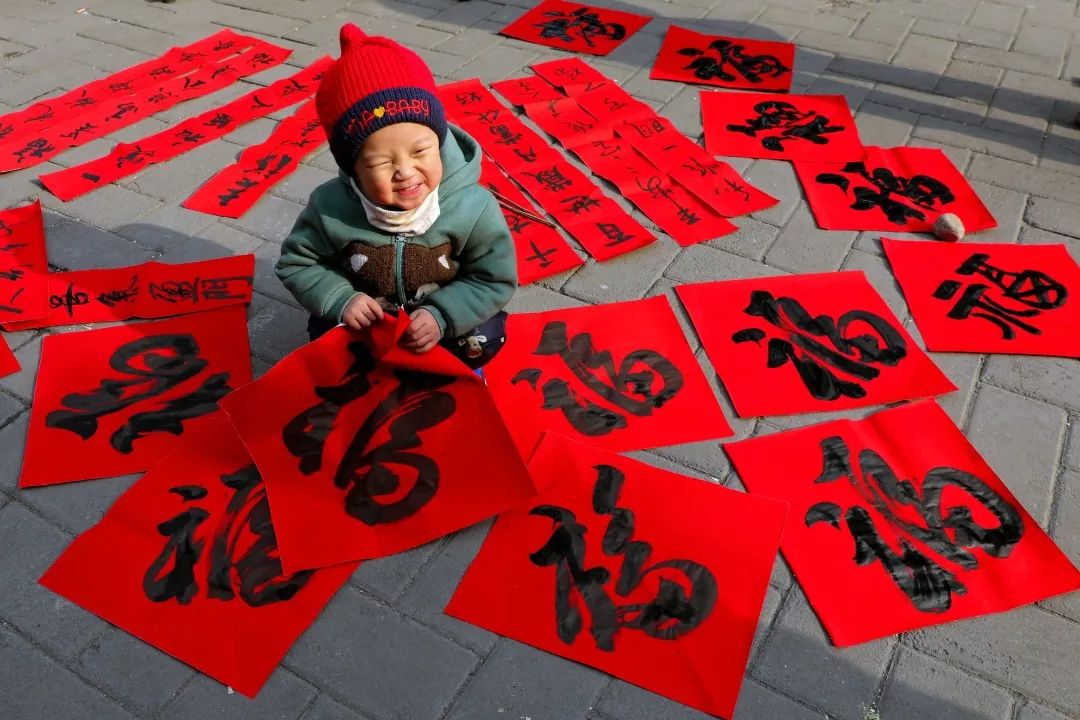 2019-1-28,河北涉縣更樂鎮。新春到來之際,書協的朋友們在大廟里揮毫潑墨寫春聯送鄉親,村娃跑來湊熱鬧,蹲在福字里陶醉,幸福又快樂。作者:滄海