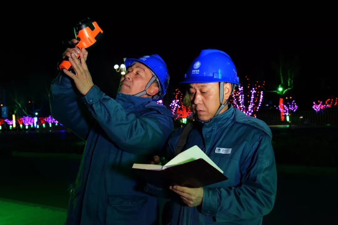 2019-01-28,山東濟南濟陽區。春節節前,電力員工對供電線路進行夜巡測溫,及時掌握線路設備的運行狀況,為全區居民春節期間可靠用電做好準備。作者:CBT