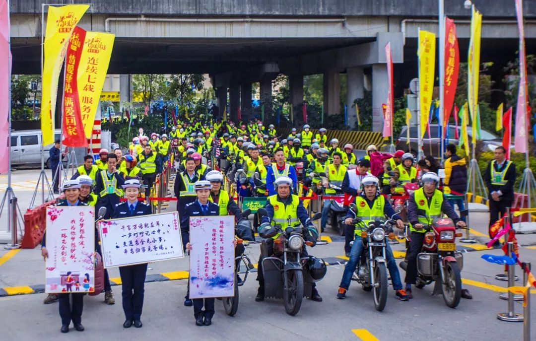 2019-01-21,廣東省佛山市。春運開始,摩托回鄉大軍在交警引導下有序前進,女警手提的告示牌上寫著“平安歸家見爸媽”。作者:獲得生命