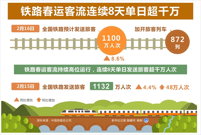 新華社北京2月16日電(記者樊曦、葉昊鳴)記者從中國鐵路總公司獲悉,16日,全國鐵路預(yù)計(jì)發(fā)送旅客1100萬人次,同比增長8.6%,加開旅客列車872列。鐵路春運(yùn)客流持續(xù)高位運(yùn)行,連續(xù)8天單日發(fā)送旅客超千萬人次。