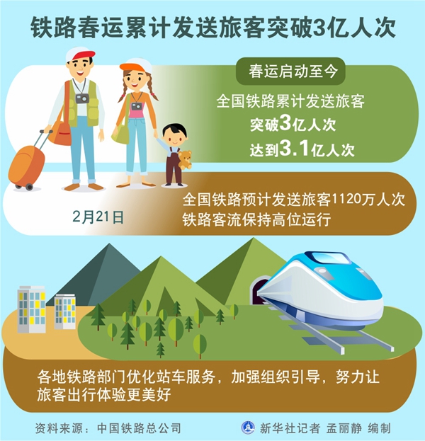 新華社北京2月21日電(記者樊曦)記者從中國鐵路總公司獲悉,春運啟動至今,全國鐵路累計發(fā)送旅客突破3億人次,達到3.1億人次。