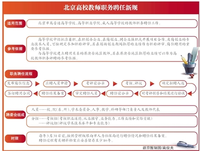 北京市人社局介紹,2005年,北京出臺了《北京市高等學校教師職務聘任管理辦法(試行)》,在全國率先下放高校職稱評審權,開展了高校教師職務聘任制改革,將教師崗位聘任條件和職稱評價標準合二為一,尊重用人單位的自主權,由高校根據學科特色和發展需要,制定不同層次教師崗位的聘任條件,按照規范的程序,以崗位聘用替代職稱評價,實現“想用的評得上,評得上的用得好”。