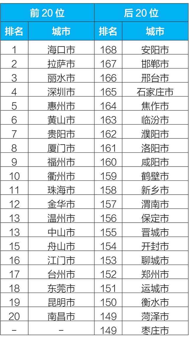 2019年1-2月,168個重點城市中臨汾、石家莊、邢臺市等20個城市空氣質量相對較差(從第168名到第149名);拉薩、海口、麗水市等20個城市空氣質量相對較好。?