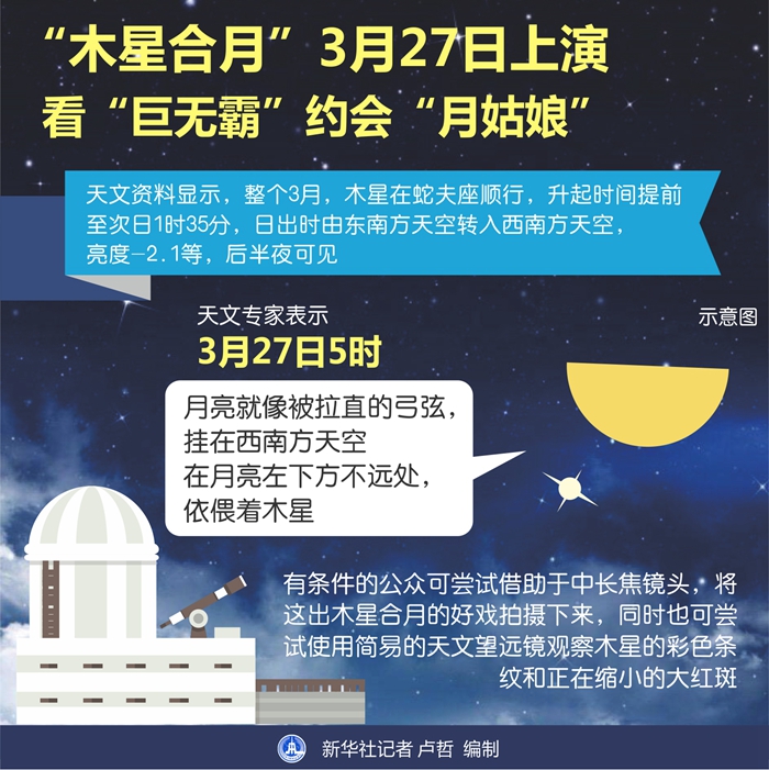 新華社天津3月24日電(記者周潤健)繼土星合月、金星合月和火星合月后,本月繁星“逐月”的“浪漫連續(xù)劇”27日繼續(xù)精彩上演,這一次的“男主角”換成了太陽系的“巨無霸”木星。天文專家表示,屆時,如果天氣晴好,有興趣的公眾和早起出行的人們可于當(dāng)日黎明前欣賞到這幕浪漫的“星月童話”。