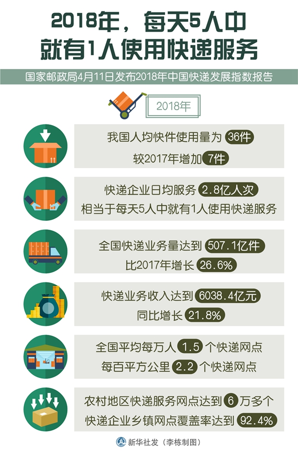 新華網(wǎng)北京4月12日電(記者 李志強(qiáng))11日,國家郵政局發(fā)布《2018年中國快遞發(fā)展指數(shù)報(bào)告》(以下簡稱《報(bào)告》)。《報(bào)告》顯示,2018年,中國快遞業(yè)務(wù)量超過美、日、歐發(fā)達(dá)經(jīng)濟(jì)體之和,規(guī)模連續(xù)五年穩(wěn)居世界第一,成為全球快遞包裹市場發(fā)展的動力源和穩(wěn)定器。