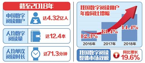 4月12日至14日,第五屆中國數字閱讀大會在杭州召開。會上發布的《2018年度中國數字閱讀白皮書》顯示,截至2018年,中國數字閱讀用戶總量達到4.32億,人均數字閱讀量達到12.4本,人均單次閱讀時長達71.3分鐘。我國數字閱讀整體市場規模已達到254.5億元,同比增長19.6%,大眾閱讀市場規模占比逾九成,是產業發展主導力量。