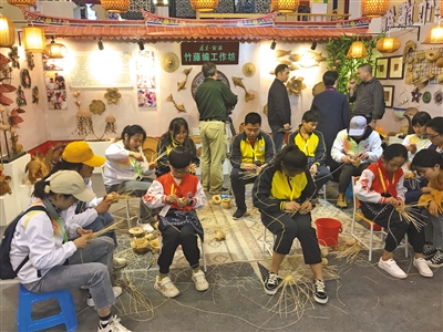 學(xué)生藝術(shù)實(shí)踐工作坊,來(lái)自福建安溪的小學(xué)生展示竹藤編。新京報(bào)記者 馮琪 攝