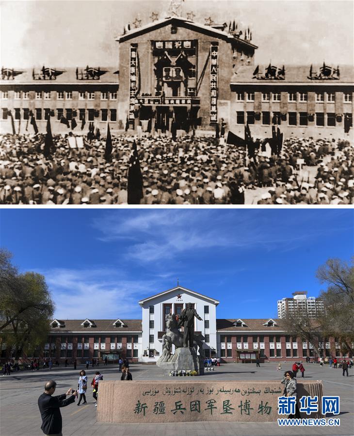 拼版照片:上圖為1952年10月拍攝的在石河子落成的中國人民解放軍第二十二兵團司令部機關辦公大樓(新疆兵團軍墾博物館提供);下圖為基于該建筑改建后的新疆兵團軍墾博物館(新華社記者王菲4月9日攝)。新華社發